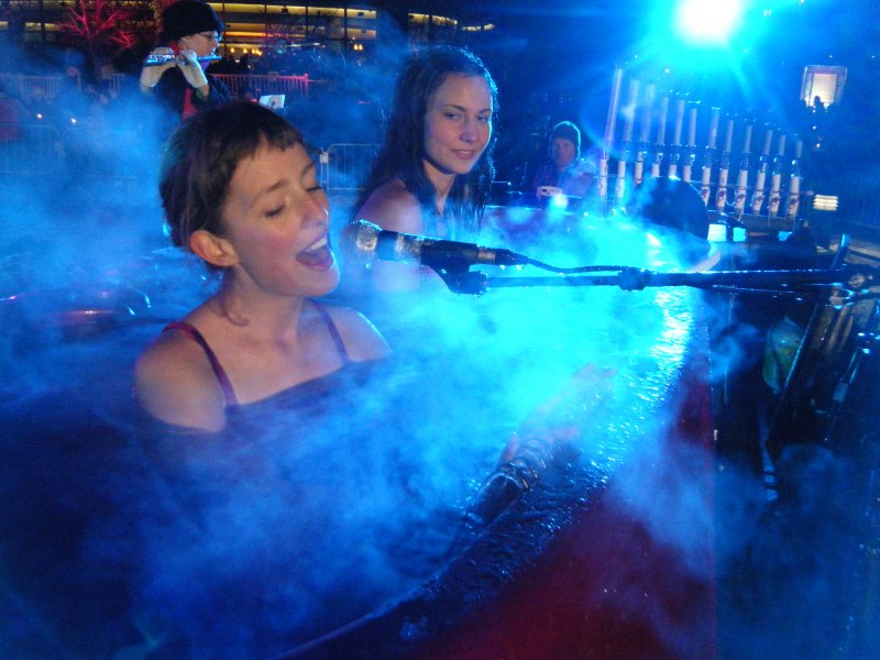 In this photo, deep bass rumbling is heard from soprano C. Mundy's careful movement of her fingers on water jets (fingers barely visible in photo).