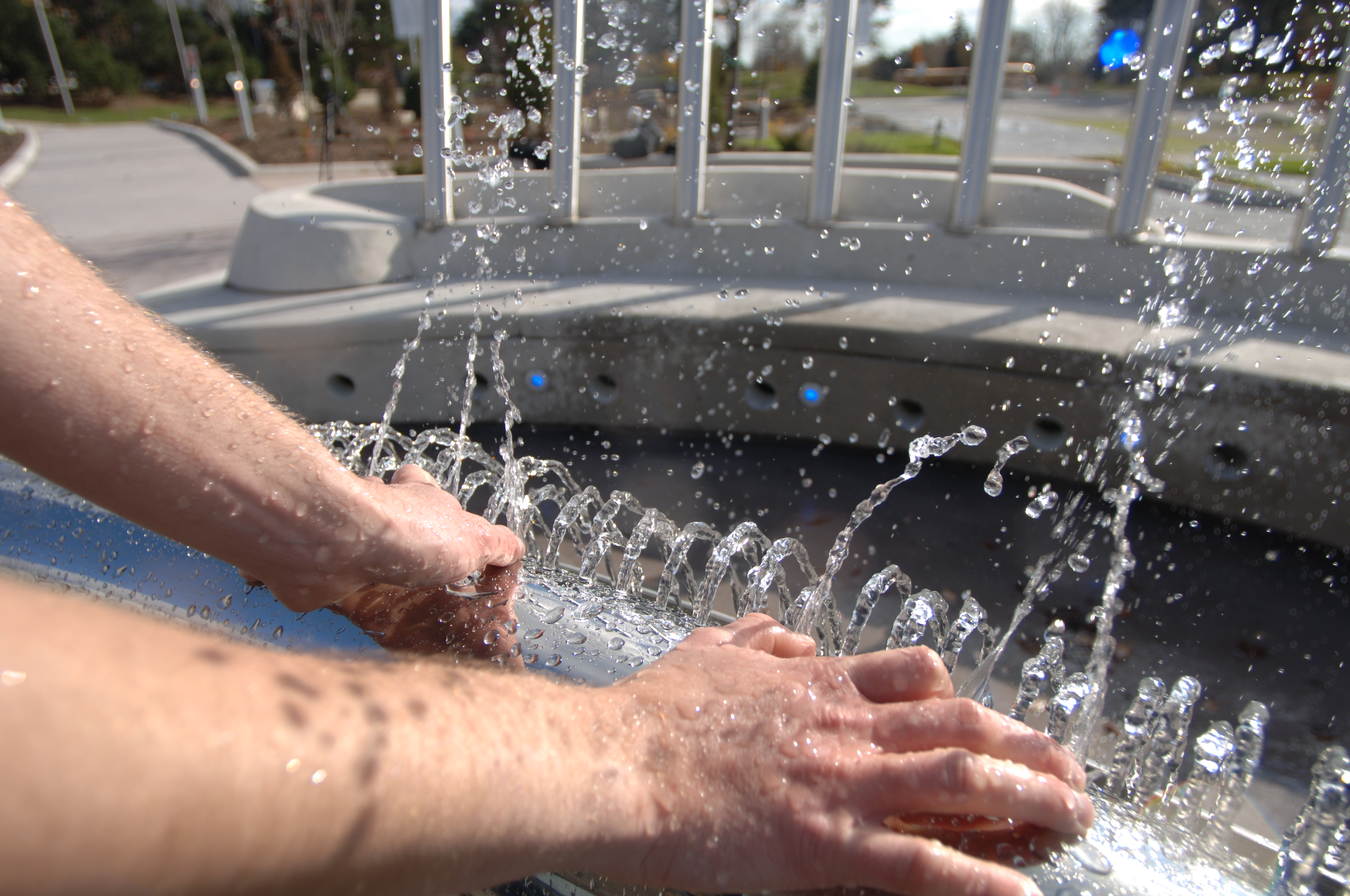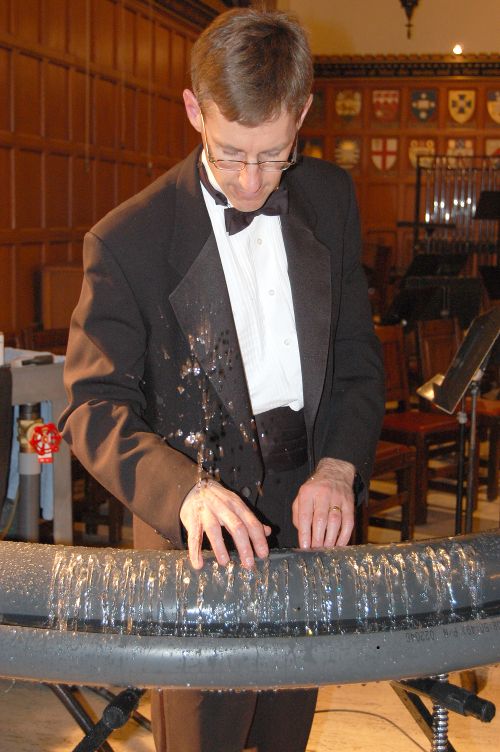 In this photo, deep bass rumbling is heard from soprano C. Mundy's careful movement of her fingers on water jets (fingers barely visible in photo).