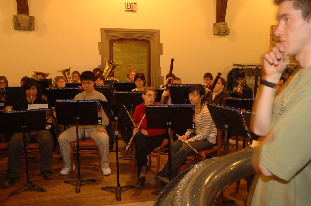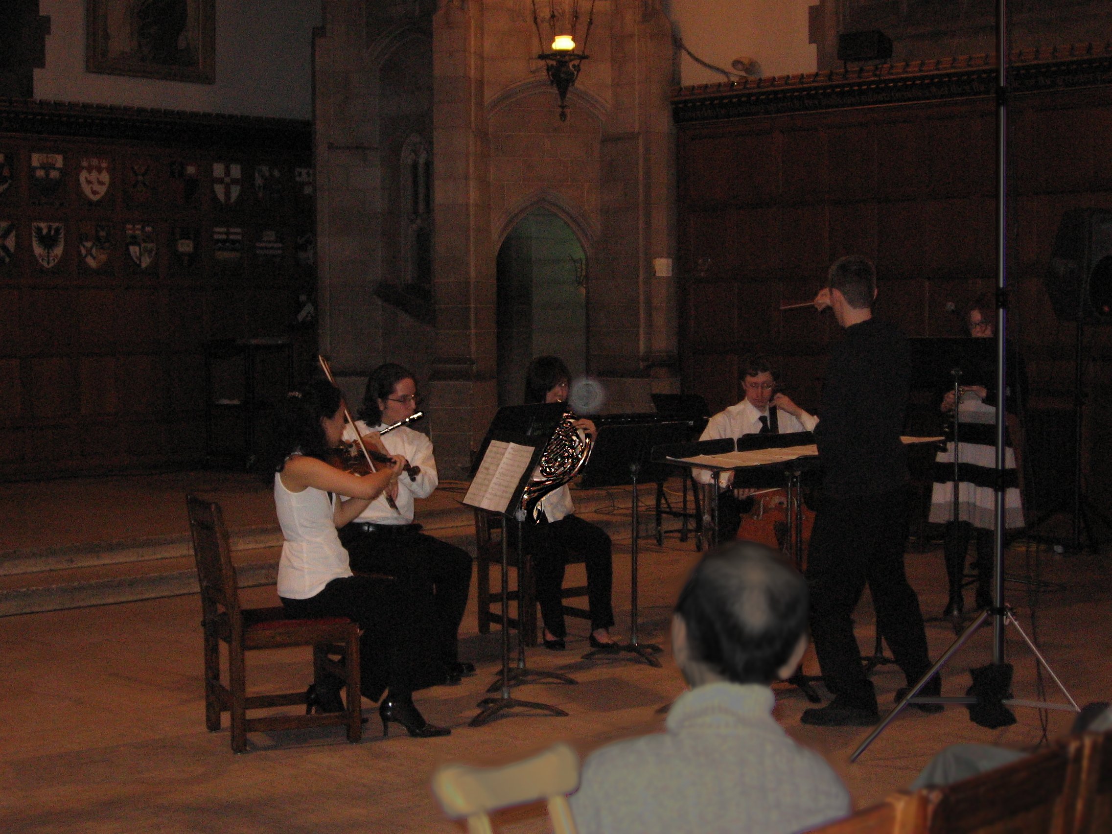 Conducting a performance with violin, flute, French horn, cello, clarinet (Saga for Clarinet no.3)